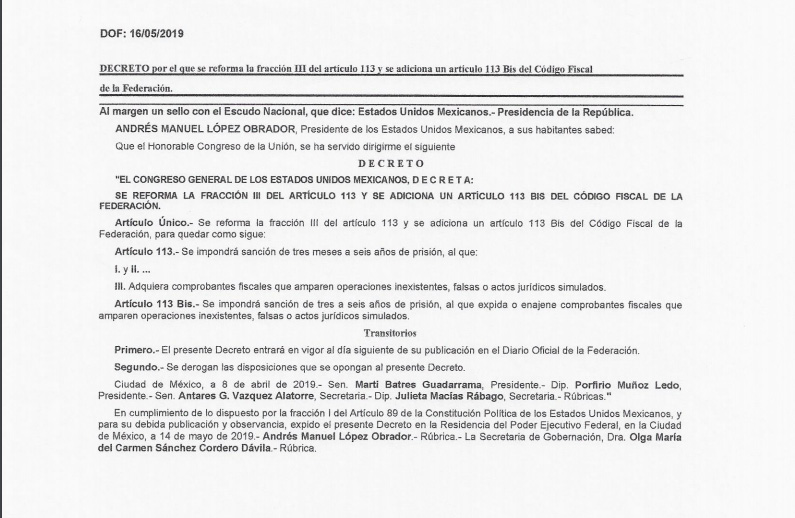 DECRETO por el que se forma la fracción III del artículo 113 y se adiciona un artículo 113 Bis del Código Fiscal de la Federación.